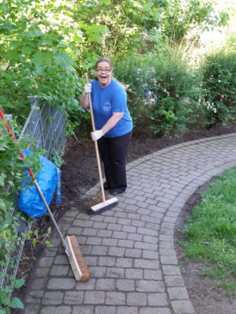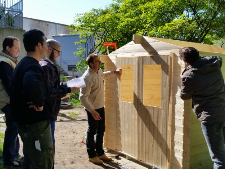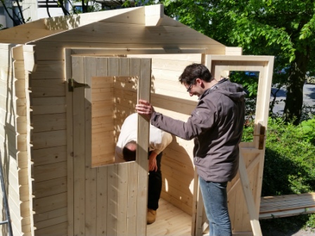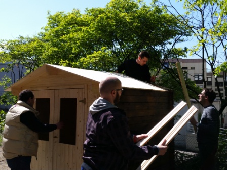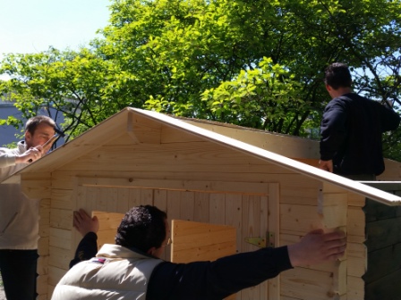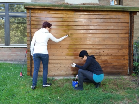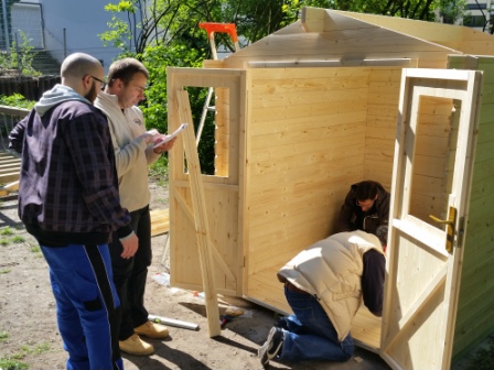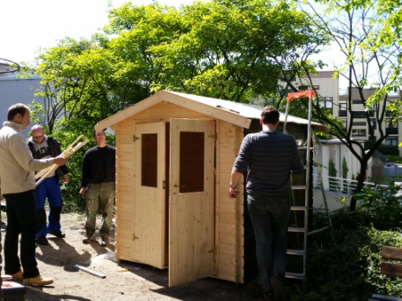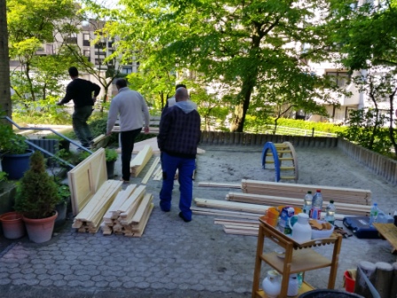 Fünf Väter haben gemeinsam das neue Gartenhaus vor der Gruppe 4 aufgebaut, damit endlich die Sandspielzeuge gelagert werden können. Frau Will, zwei Kolleginnen, einige Mütter und zwei kleine Helfer haben u.a. Unkraut gezupft, Hecken geschnitten, Gartenhäuser, Blumenkübel und Holzgeländer lasiert.